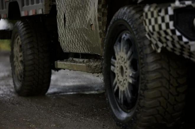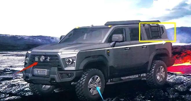 车身造型方正硬朗,相比路虎卫士也不遑多让,并具备越野车的高离地间隙、侧踏板等元素,整体风格十分强悍,而突出的黑色轮眉无不彰显硬派力量感,搭配专业的越野全地形轮胎,让其具备更强的通过性和攀爬能力。同时,位于C柱和D柱的后部车顶与车身焊接还可以拆卸,并配备折叠小梯子和框式行李架,不仅拥有更好的空间扩展能力,还更具越野属性。